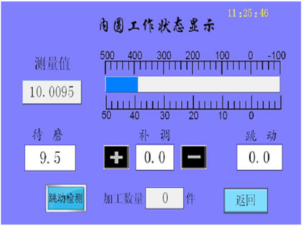 當(dāng)各種數(shù)值都設(shè)定好后,在“加工中操作面板”點擊“啟動”按鈕,便進入自動測量狀態(tài)(儀器上電時自動進入)。外徑與內(nèi)徑對應(yīng)不同的工作狀態(tài)顯示界面,分別如下圖所示: